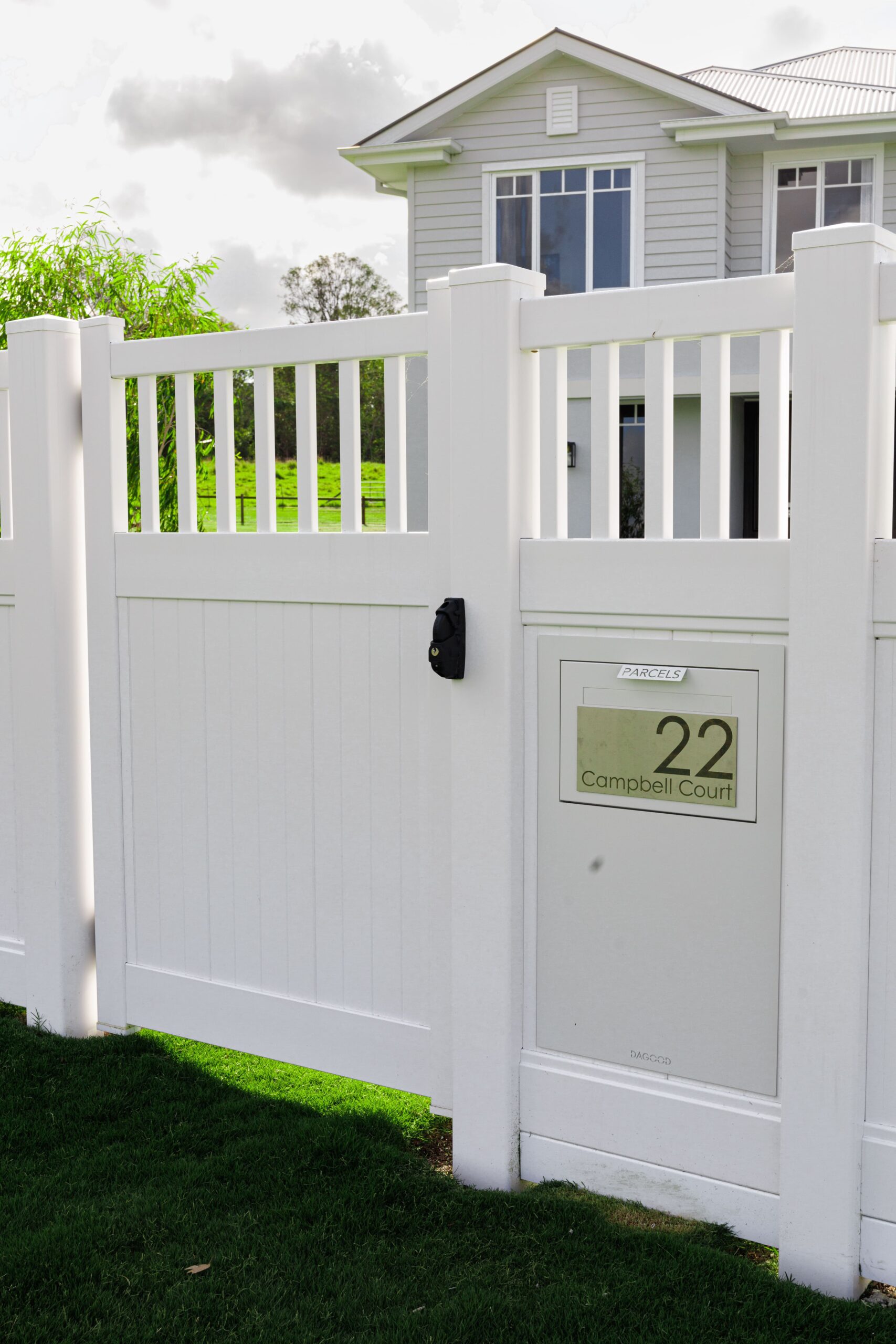 Mary PVC fence gallery letterbox panel and gate detail by Queensland Fencing Specialists