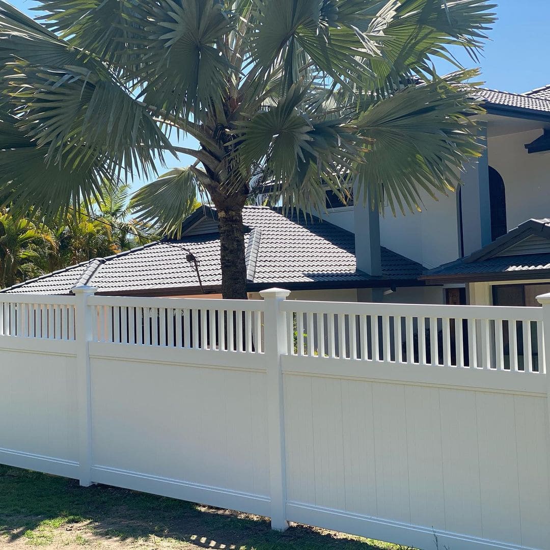 Mary PVC fence gallery privacy fence beside a palm-lined home by Queensland Fencing Specialists