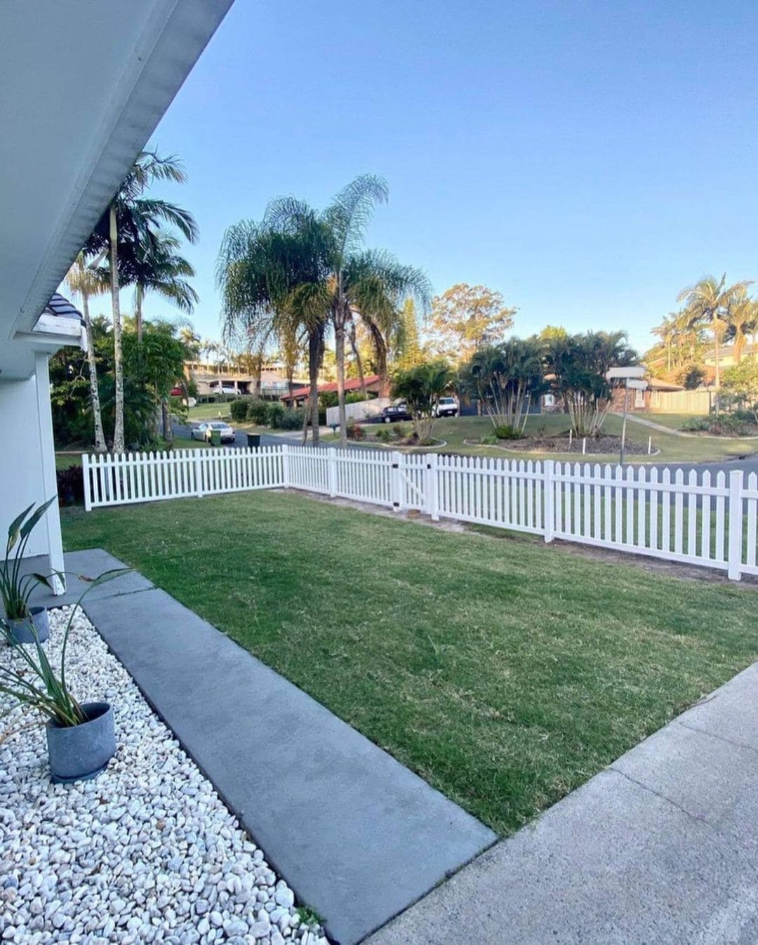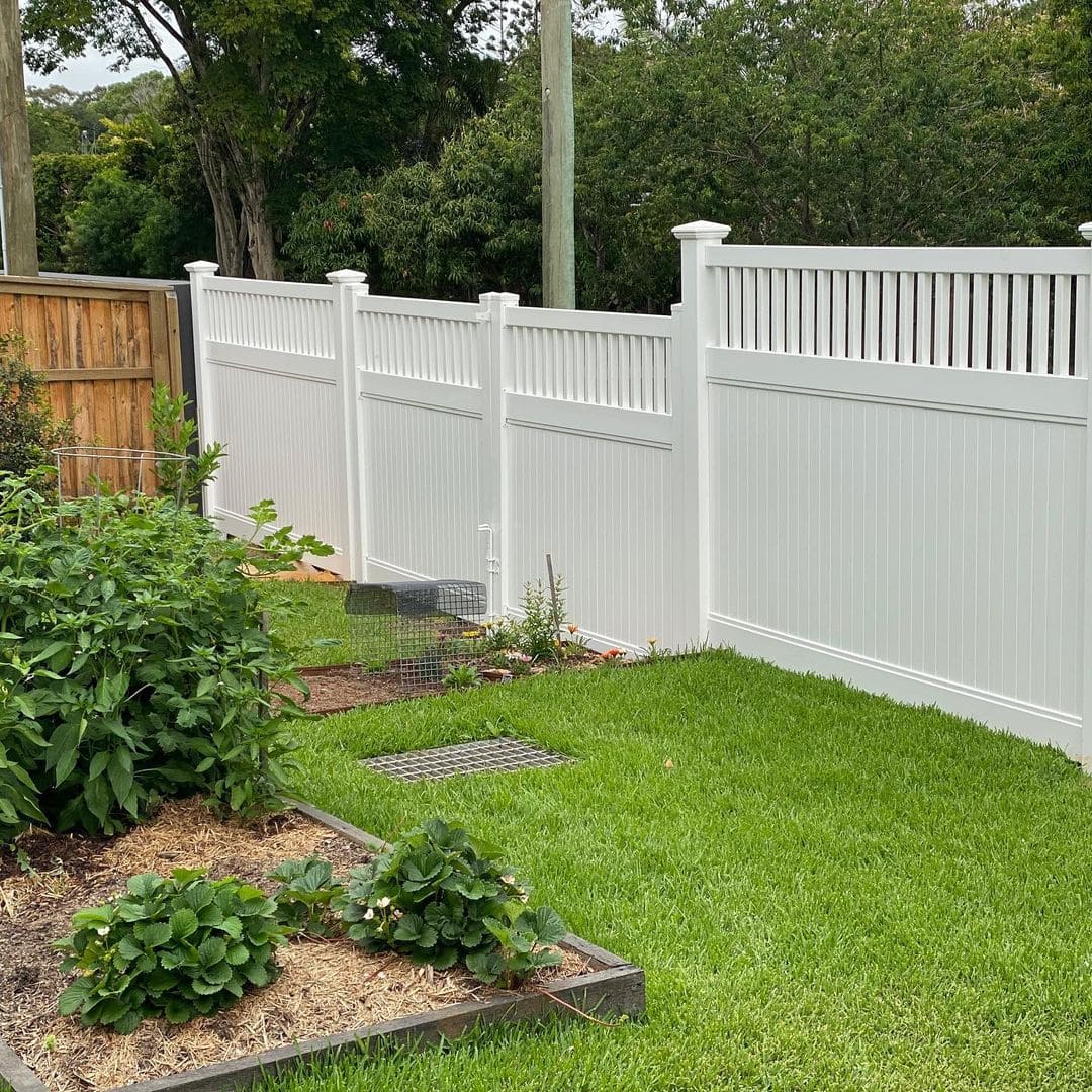 Margaret PVC garden fence gallery corner boundary in a landscaped yard by Queensland Fencing Specialists