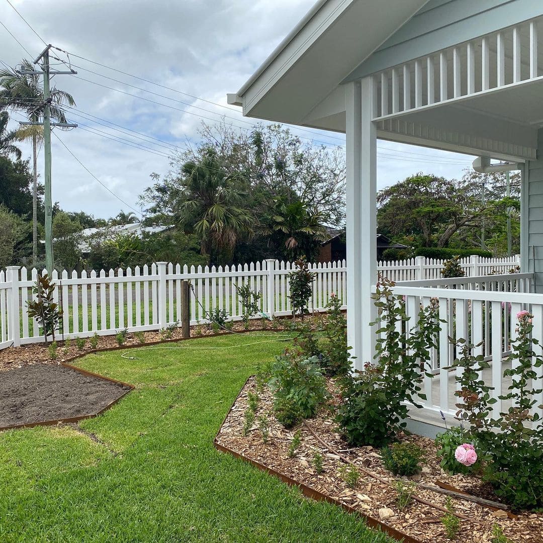 Mary PVC fence gallery backyard installation with garden edging by Queensland Fencing Specialists