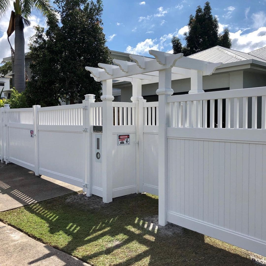 Mary white PVC boundary fence with entry gate and pergola at a Queensland home